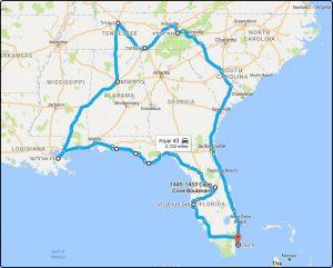 המסלול: פלורידה -> אלבמה -> מיסיסיפי -> לואיזיאנה -> אלבמה (שוב) -> טנסי -> צפון קרוליינה -> דרום קרוליינה -> ג'ורג'יה -פלורידה